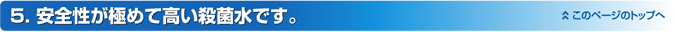 | カンファ水は手指洗浄などで使用する場合、中性に近い弱酸性、低濃度で使用できるために皮膚の炎症や手荒れなどを起こしません。また、体内に吸収したカンファ水の殺菌力の主成分である次亜塩素酸(HOCl)は人体内で細菌などの異物と反応した後効果が残留しないため人体に影響を与えず無害です。 |
