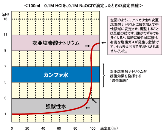 | 次亜塩素酸ナトリウムに酸性系のものを混ぜ合わせると、pH9前後からpH3前後に急激に下がり、その結果有毒な塩素ガスが発生し、人体に非常に危険でした。今までは、塩素ガスが発生せず、殺菌効果の高い中性領域を維持することが技術的に困難だったのです。しかし、最新技術により、この難関を解決したのがカンファシステムなのです。 |