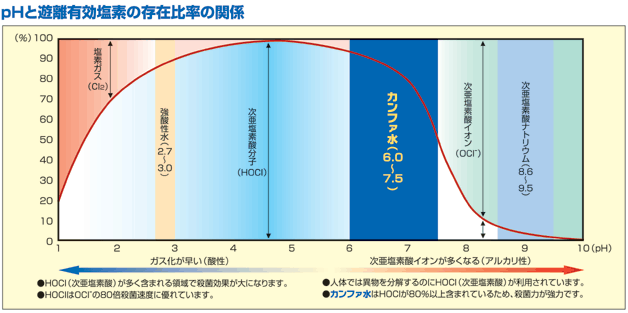 | カンファ水生成装置は、次亜塩素酸が強力な殺菌作用を発揮するpH5.5からpH7.5まで自在にコントロールできます。 |