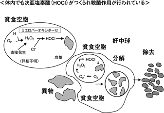 | 血液中で次亜塩素酸が発生しているという事は意外と知られていません。活性酸素が体内に侵入した細菌などの異物を分解しているといわれていますが、実際は次亜塩素酸に変化した形で働いているのです。というのは、好中球にはミエロパーオキシターゼという酵素が大量に存在し、活性酸素の一種である過酸化水素を塩素イオンと反応させ次亜塩素酸を作り出すからです。好中球がこの次亜塩素酸を生成させるのは「安全に殺菌するため」なのです。生命は数億年かけて、この次亜塩素酸による殺菌を行っていたのです。 |