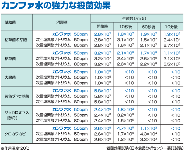 カンファ水は、厚生労働省が定めている食品添加物である殺菌剤の「次亜塩素酸ナトリウム」と食品添加物の「希塩酸」を水で希釈混合させて生成するため、食品の殺菌用としてご使用いただけます。 厚生労働省の見解(通達) |